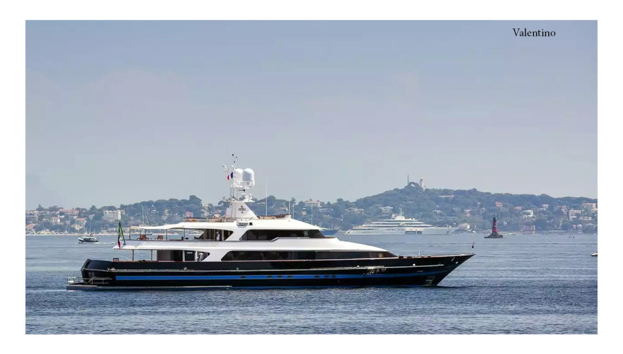 Valentino, Blue One. Σχεδιασμένο με την επιμέλεια του διάσημου designer, το σκάφος των 46,32 μέτρων δημιουργήθηκε με τη συνεργασία του Valentino Garavani, αλλά και τη συμμετοχή του Peter Marino και του Gerhard Gilgenast, δύο σπουδαίων σύγχρονων designers. Τροφοδοτείται από δύο κινητήρες Caterpillar, φτάνοντας μέγιστη ταχύτητα 14-16 κόμβων και ταχύτητα πλεύσης 12 κόμβων και διαθέτει ατσάλινο κύτος με αλουμινένια κατασκευή, με χαρακτηριστικό χρώμα το μπλε σκούρο και twist από ανοιχτόχρωμες μπλε αποχρώσεις.