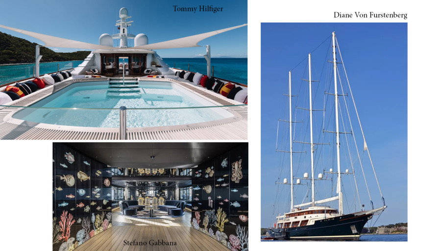Tommy Hilfiger, Flag. Το mega yacht του διάσημου Αμερικανού σχεδιαστή μήκους 62 μέτρων, πουλήθηκε πριν από δύο χρόνια προς 39,5 εκατομμύρια ευρώ σε Έλληνα εφοπλιστή. Διαθέτει 7 σουίτες που φιλοξενούν έως 18 επισκέπτες, 17 άτομα πλήρωμα, ανελκυστήρα, γυμναστήριο, τζακούζι και ξυλόφουρνο για πίτσα στο κατάστρωμα, καθώς ο Hilfiger είναι φανατικός θαυμαστής της Ιταλικής κουζίνας. Το εσωτερικό του σχεδιάστηκε από τον διάσημο Chahan Minassian και ακολουθεί μια κλασική αισθητική με ανοιχτόχρωμο ξύλο και ναυτικές διακοσμητικές λεπτομέρειες.