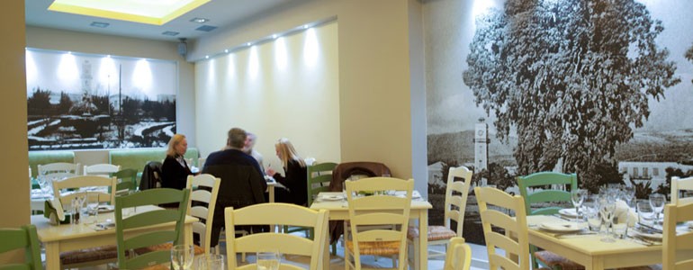 Μια κατάφωτη σάλα με τζαμαρία μπροστά, πάνω στην Λεωφόρο Μεσογείων δύσκολα μπορεί να μεταμορφωθεί σε θερμό, νέο-παραδοσιακό εστιατόριο. Οι –αναπόφευκτες- λευκοβαμμένες καρέκλες, οι δεκάδες παλιές διαφημίσεις και δημοσιεύσεις για το εστιατόριο αλλά και η μεγάλη ασπρόμαυρη φωτογραφία της ελιάς στον τοίχο δεν αρκούν για να δημιουργήσουν ατμόσφαιρα στον μάλλον ψυχρό χώρο. Ευτυχώς που οι άνθρωποι εκεί είναι ζεστοί και φιλόξενοι και καταφέρνουν σε ένα βαθμό ότι δεν κατορθώνει η διακόσμηση.