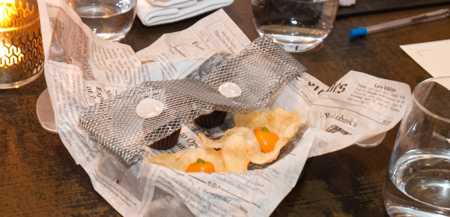 Μπροστά σε κάθε θέση υπάρχει το συλλεκτικό μενού με ένα σκίτσο των τριών συντελεστών σχεδιασμένο από τον Ιάσονα Δεληγιάννη- Φέτση. Αφετηρία η Ελλάδα με τα amuse bouche: γαρίδες Μικρολίμανο αλλιώς σε ένα κράκερ γαρίδας,