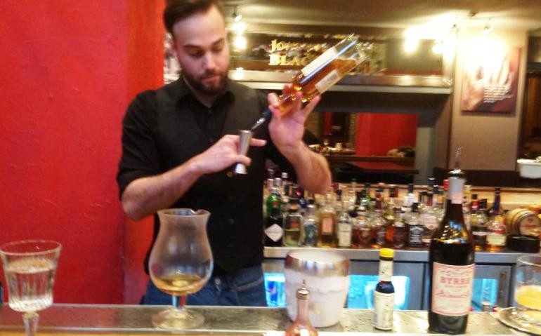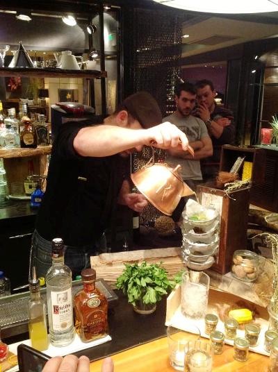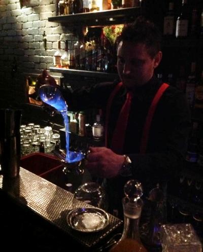 Αφήνουμε, για την ώρα, το Elvis και πάμε λίγο παραπέρα, στο La Doze. Εδώ συναντάμε καταρχήν τον Αλέξανδρο Σουρμπάτη (φωτογραφία). Ο Αλέξανδρος είναι από την Αθήνα, έχει δουλέψει αρκετά στο εξωτερικό (ιδιαίτερα στη Γερμανία) και έχει μια πολύ τολμηρή ιδέα. Μας υποδέχεται με ένα νερό καπνιστό με κάρδαμο, κίνηση που μας προετοιμάζει για ένα κοκτέιλ-βόμβα. Οι κινήσεις του είναι πολύ σίγουρες, η παρουσίασή του πειστική και οι προσδοκίες επιβεβαιώνονται. Έμπνευσή του είναι το Bloody Mary. Ονομάζει το κοκτέιλ του Ο Κόλπος της Καλυψώς και η βάση του είναι το Talisker μαζί με χυμό παντζάρι! Συμπληρώνει τζίντζερ πολτοποιημένο, λίγο balsamico με σύκο και Sherry Pedro Ximenez, ντύνει το χείλος του ποτηριού με τζίντζερ και μαύρο αλάτι Χαβάης! Το αποτέλεσμα είναι ένα ιδιαίτερα πληθωρικό κοκτέιλ, πολύ τολμηρό, πολύ ενδιαφέρον που πλημμυρίζει τις αισθήσεις με την έντασή του. Το συνόδευσε με ένα φρέσκα blueberries σε Talisker, ντυμένα με σοκολάτα 96%. Δυνατό και ενδιαφέρον κοντράστ, αν και πιστεύω ότι θα του πήγαινε ακόμη περισσότερο κάτι πιο «αλμυρό». Επόμενος, ο δεύτερος bartender του La Doze, o Ιάσονας Ανθόπουλος, ένα νέο παιδί με ταλέντο και πολύ καλή παρουσία που μας ετοιμάζει ένα twist στο El Presidente, το El Saval (ο μάγκας) με τεκίλα Don Julio Anejo, Grand Marnier, λίγο Pimmento και ένα μίγμα βερμούτ Carpano Bianco & Classico infused με πράσινο και μαύρο τσάι, τζίντζερ και κάρδαμο. Η παρουσίασή του είναι λιτή αλλά ουσιαστική και στιλάτη και το κοκτέιλ του έξοχα ζυγισμένο και πολύπλοκο! Σειρά έχει ο Πάνος Γιοβάνης, ένας ακόμη φιλοξενούμενος bartender από το εξαιρετικό μπαρ Ten της Λαμίας. Ο Πάνος Γιοβάνης μας μεταφέρει νοητά στο Harry’s bar στο Παρίσι με μια πολύ καλή παρουσίαση. Έχει στιλ και ουσία και προτείνει το Golden Era, με Don Julio Reposado & Bianco, βερμούτ infused με σοκολάτα, καφέ και πορτοκάλι. Το περνά από κανατούλα καπνισμένη με ξύλο οξιάς και μήλο και το αποτέλεσμα είναι ένα δυνατό, θαυμάσια ισορροπημένο κοκτέιλ με ατέλειωτη επίγευση.
