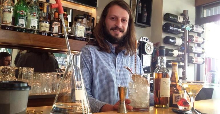 Ο διαγωνισμός ξεκινά στο μπαρ Elvis όπου φιλοξενούνται και οι συμμετοχές εκτός Θεσσαλονίκης. Έτσι, ξεκινάμε με τον Χαράλαμπο Μωυσίδη από το μπαρ Adesso της Δράμας που μας προτείνει το Tender’s μια ενδιαφέρουσα “vegetarian” παραλλαγή του κλασικού Vesper Martini. Αναμιγνύει Ketel One και Tanqueray Ten, προσθέτει βερμούτ Carpano Bianco και Noilly Prat και συμπληρώνει σπιτικά bitters λαχανικών. Γαρνίρει με μια ροδέλα κρεμμύδι (!) που παρόλο που το έχει …απαλύνει στο νερό αποδεικνύεται η αχίλλειος φτέρνα του κοκτέιλ του. Σειρά έχει ο έμπειρος Τάσος Γιέχος (Βλ. φωτογραφία), από το μπαρ Σελήνη της Καβάλας, ένας από τους περσινούς φιναλίστ. Ετοιμάζει το Simple Things, ένα twist του Manhattan. Ξεκινώ καταρχήν από το θαυμάσιο βερμούτ που ετοίμασε για το Show your Spirit και που χρησιμοποίησε και για το κοκτέιλ του αυτό, το ερυθρό Hippocrates. Σε μια βάση ένα blend από Μαυροδάφνη και Merlot, o Γιέχος συμπλήρωσε γλυκό κρασί Σάμου, λίγο Zacapa και Metaxa και αρωμάτισε με 39 διαφορετικά βότανα, μπαχαρικά και αποξηραμένα φρούτα. Το Simple Things είναι ένα ιδιαίτερα καλοζυγισμένο και σύνθετο κοκτέιλ με Cardhu, Talisker, Grand Marnier, το βερμούτ που σας περιέγραψα και bitters περγαμόντο (Soulshakers) και Abbot’s (είχε μάλιστα το αυθεντικό μπουκαλάκι της δεκαετίας του ’60!). Το σέρβιρε σε ποτήρι ελαφρά καπνισμένο με ξύλο από βαρέλι ουίσκι και γλυκό κουταλιού περγαμόντο που του ταίριαζε ωραία. Επόμενος διαγωνιζόμενος ο Λάζαρος Ράπτης από το μπαρ Καλντέρα της Κατερίνης. Μας υποδέχεται με ένα αναψυκτικό με λίγο Grand Marnier, αρωματισμένο με φλούδες λάιμ. Στην συνέχεια ετοιμάζει το κοκτέιλ του, το Nouvelle Vague, μέσα σε ένα σιφόν σόδας. Αναμιγνύει Grand Marnier infused με ροζ και μαύρο πιπέρι, σπιτικό λικέρ τσουκνίδας, φλούδες περγαμόντο και μαύρο, καπνιστό αλάτι. Στην συνέχεια το περνά από το mixing glass με λίγο χυμό μαρασκίνο, chocolate bitters και ζεστ περγαμόντο. Το κοκτέιλ του έχει εξαιρετική και σύνθετη μύτη όμως στο στόμα μας τα χαλάει το κοντράστ γλυκού και αλμυρού.