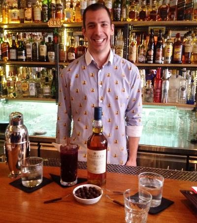 Επιστρέφουμε στο κέντρο, στο bar Kokalo, όπου συναντάμε τον Θοδωρή Μανωλά από το διπλανό μπαρ Υφήλιος. Θέμα του το ουίσκι και …This a Man’s World στο ποτήρι και στα ηχεία. Cardhu, σιρόπι λουίζας, σιρόπι αγγουριού, Soulshakers aromatic bitters σε ποτήρι που ψεκάζεται με Σάμος Grand Cru…αποτέλεσμα; Το απόλυτο, θηλυκό κοκτέιλ με βάση το ουίσκι! Γλυκόπιοτο, καλοζυγισμένο, κομψό, θηλυκό! Το συνόδευσε με ένα μικρό σάντουιτς με ροκφόρ και αποξηραμένο σύκο που του ταίριαξε υπέροχα, αλλά και σπαράγγια με καπνιστό σολομό που δεν είχαν καμία σχέση με το ποτό.